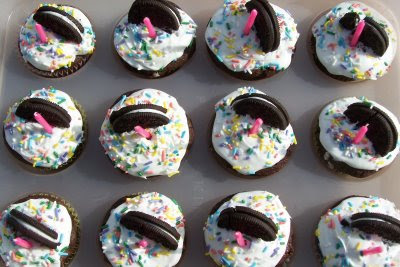 Once cool, use an offset spatula to frost the cupcakes. Then sprinkle each cupcake with the jimmies. Next, take an oreo half and stick it into the middle of the cupcake (the frosting should help them stand on their own. Then add your birthday candles! Light, make a wish, and most importantly... enjoy!